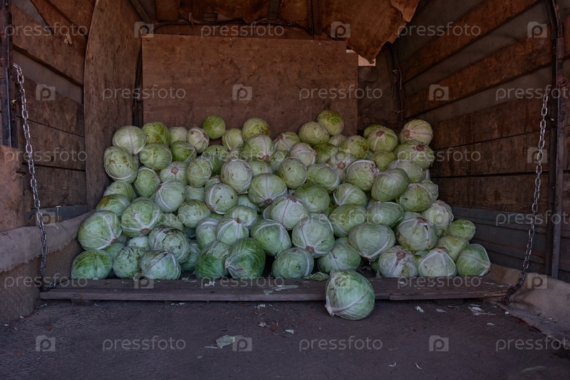 Куча свежесобранной немытой капусты лежит на старом деревянном складе сельскохозяйственной продукции