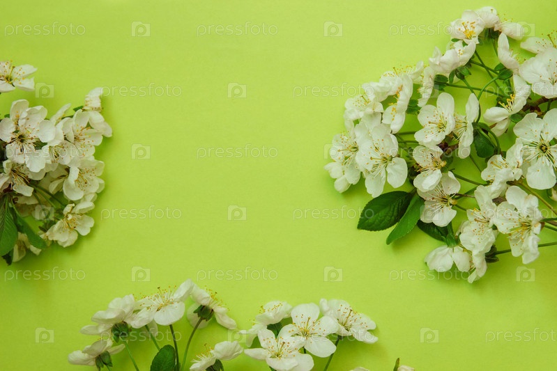 Рамка из белых вишневых цветов крупным планом на ярко-зеленом фоне, концепция поздравительной открытки, дизайн, украшение, приветствие с пустым пространством для текста, шаблон