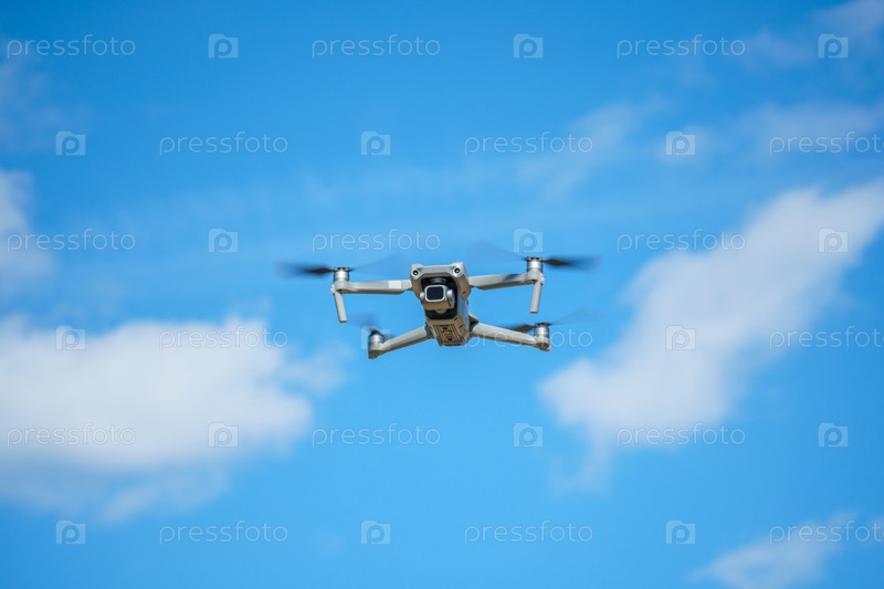 Дрон с цифровой камерой высокого разрешения летит на фоне голубого неба с облаками, дрон парит в воздухе на фоне неба, коптер парит в воздухе