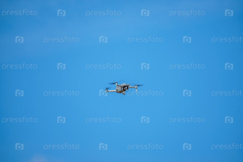 Дрон с цифровой камерой высокого разрешения летит на фоне голубого неба с облаками, дрон парит в воздухе на фоне неба, коптер парит в воздухе
