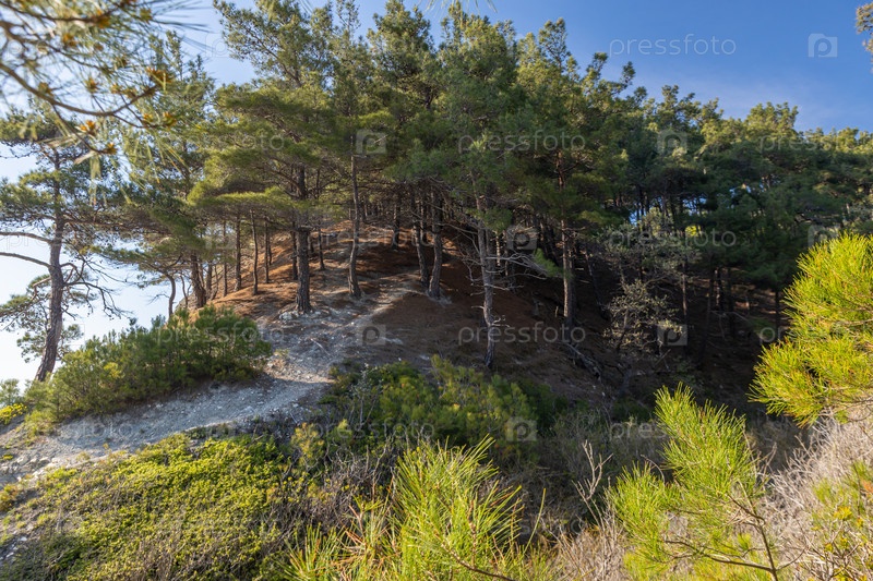 Лес на скале, лесной пейзаж с голубым небом