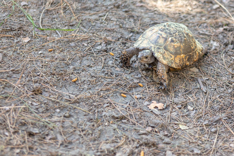 Черепаха в лесу, ползает по лесной траве