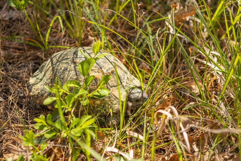 Черепаха в лесу, ползает по лесной траве