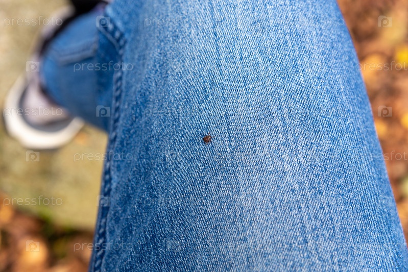 Маленький клещ-паразит, обнаруженный на синих джинсах, штанинах человека. Насекомое крошечное, черное и напоминает о том, что нужно проверить клещей, чтобы избежать потенциальных болезней, таких как лайм