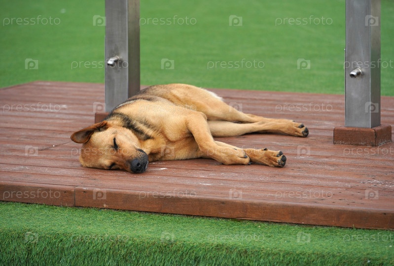 Большая собака спит на деревянной платформе, которая расположена на зеленой лужайке