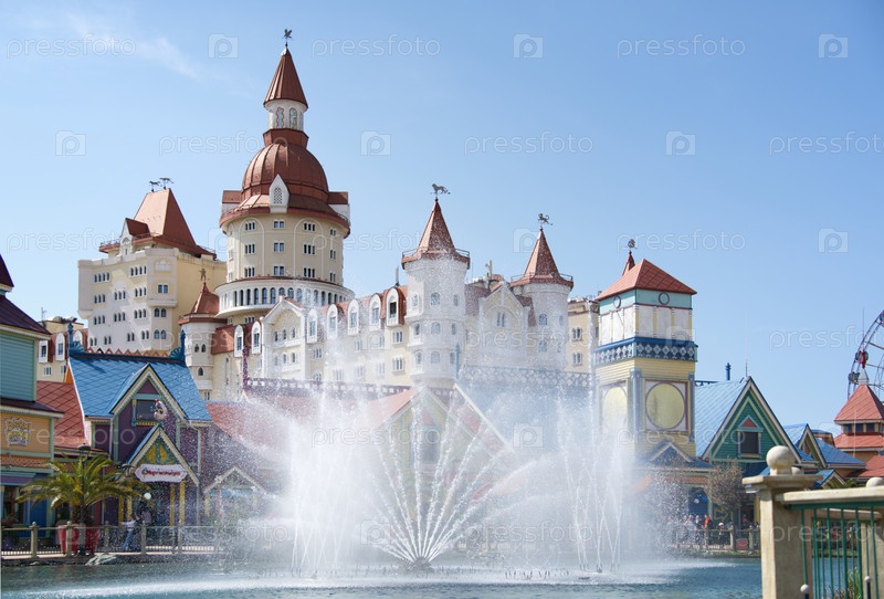 Фонтан на фоне старинного замка и голубого неба