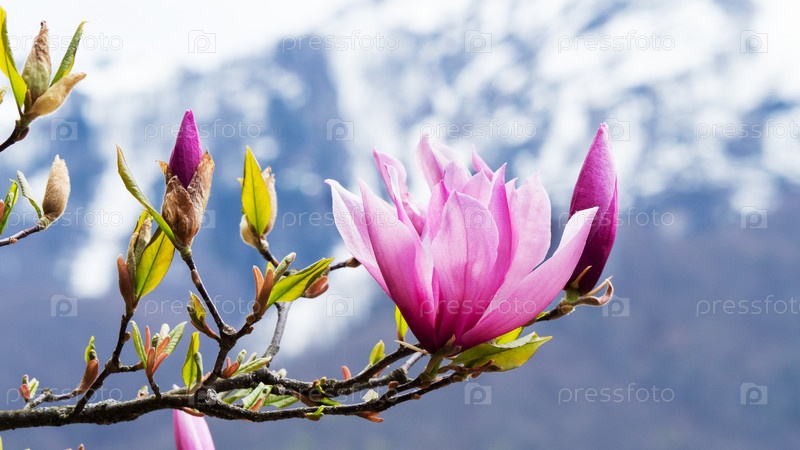 Розовые цветы магнолии цветут в дикой природе на фоне заснеженных гор. Магнолия звездчатая, выборочный фокус