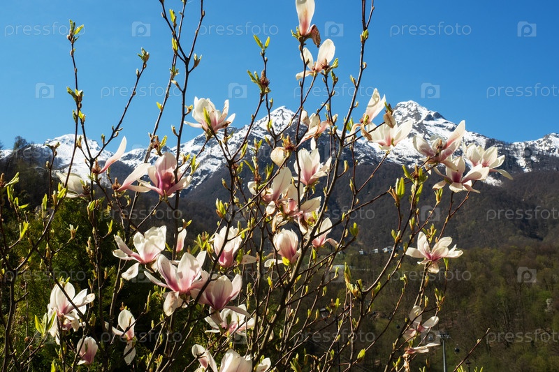 Белая магнолия цветет цветущим деревом в дикой природе на фоне заснеженных гор. Магнолия звездчатая, выборочный фокус