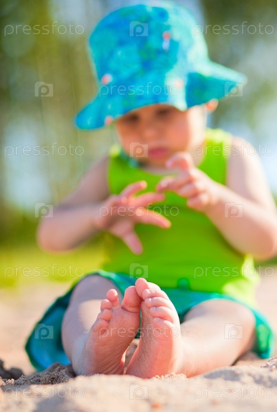 Милый ребенок сидит на песке