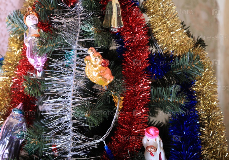 Игрушки на зеленой рождественской ели