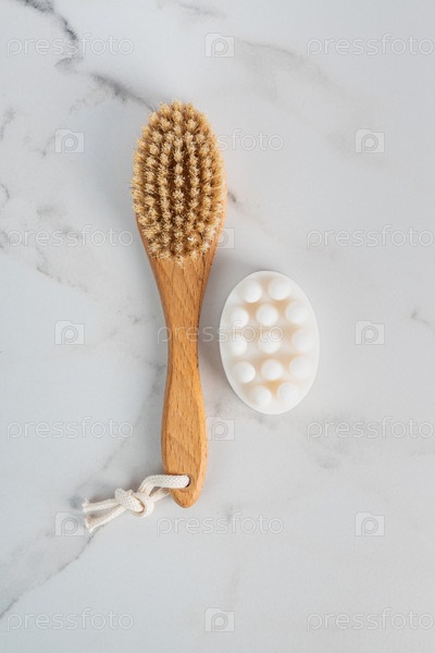 Вид сверху на массажное мыло с сухой массажной щеткой для домашних спа-процедур против старения