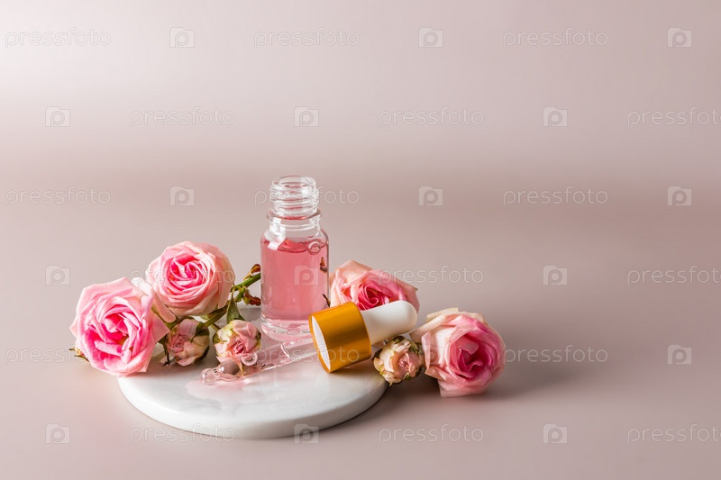 Косметический продукт на основе розового масла в стеклянной открытой бутылке и наполненной пипетке. пастельный фон с копией пространства. натуральная косметика