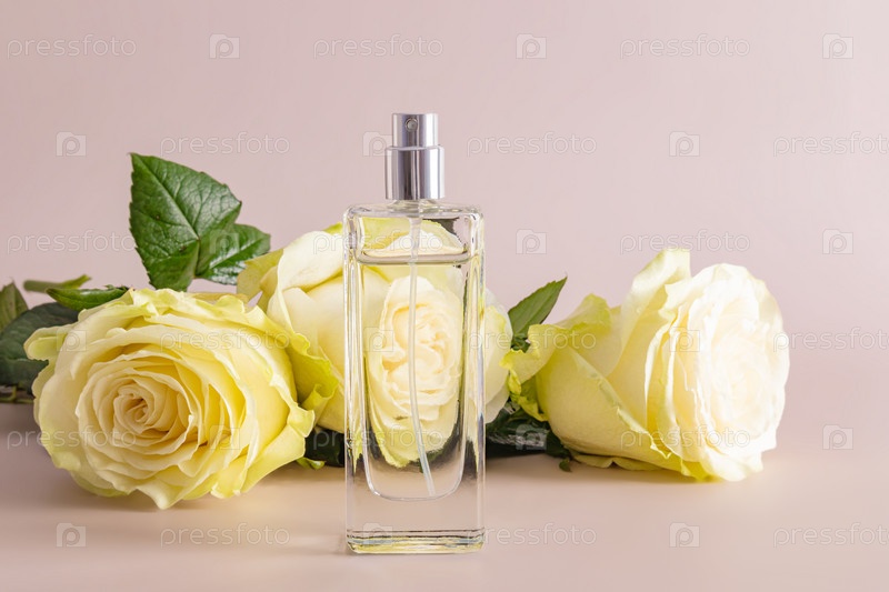 Передний план шикарного флакона женских духов со свежей чайной розой. пастельный фон. место для вашего текста. презентация аромата