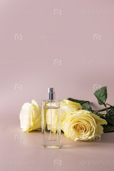Шикарный высокий флакон женских духов или туалетной воды на пастельном фоне с тремя чайными розами. Вертикальный вид. пространство для копирования
