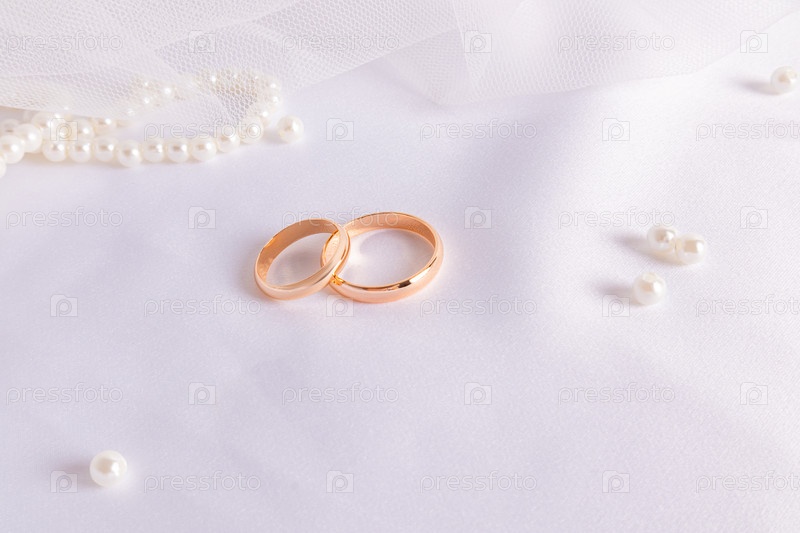 Два золотых обручальных кольца на белой атласной ткани с жемчужными бусинами. Свадебный праздничный фон. Копия пространства