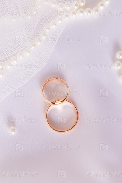 Два золотых обручальных кольца на шикарном белом атласном фоне с жемчужным ожерельем. Вертикальный свадебный фон. макет для дизайна