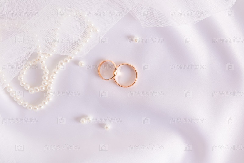Два золотых обручальных кольца на белой атласной ткани с жемчужными бусинами и фатой. Свадебный праздничный фон. Копия пространства
