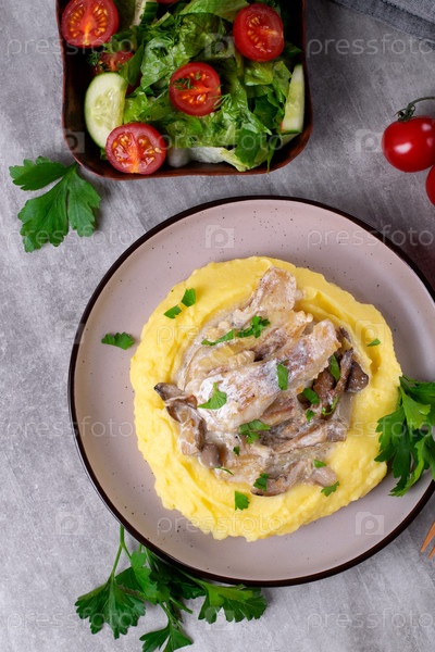 Бефстроганов с белой рыбой в сметанном соусе подается с картофельным пюре на сером столе. Вид сверху