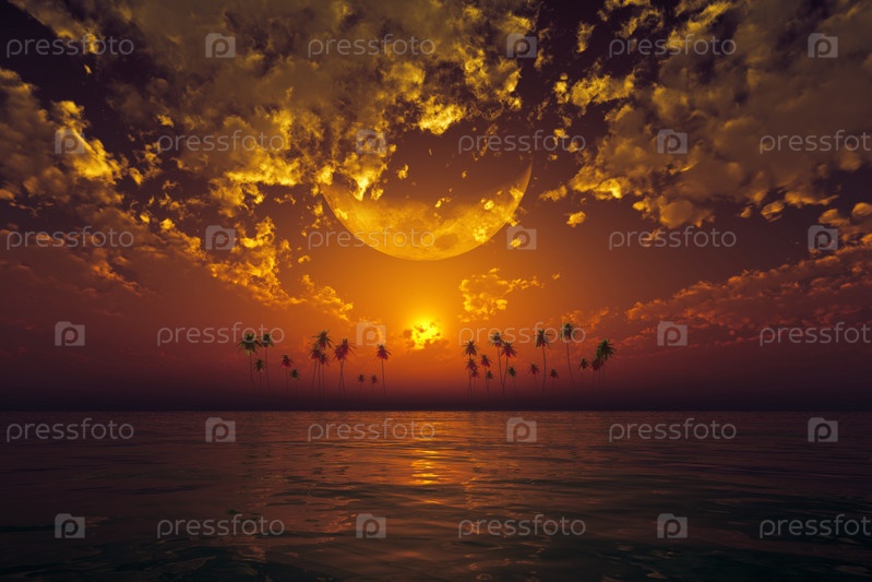 Большая луна в оранжевых облаках