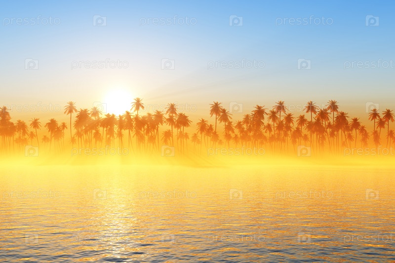 Солнечные лучи над кокосовыми пальмами