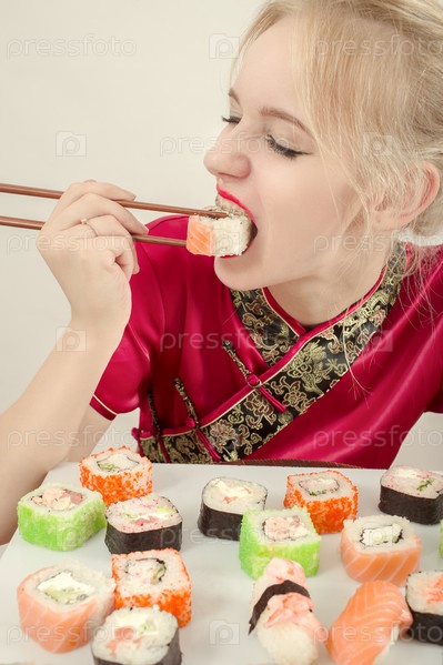 Голодная веселая девушка ест суши на белом фоне, тонированное изображение