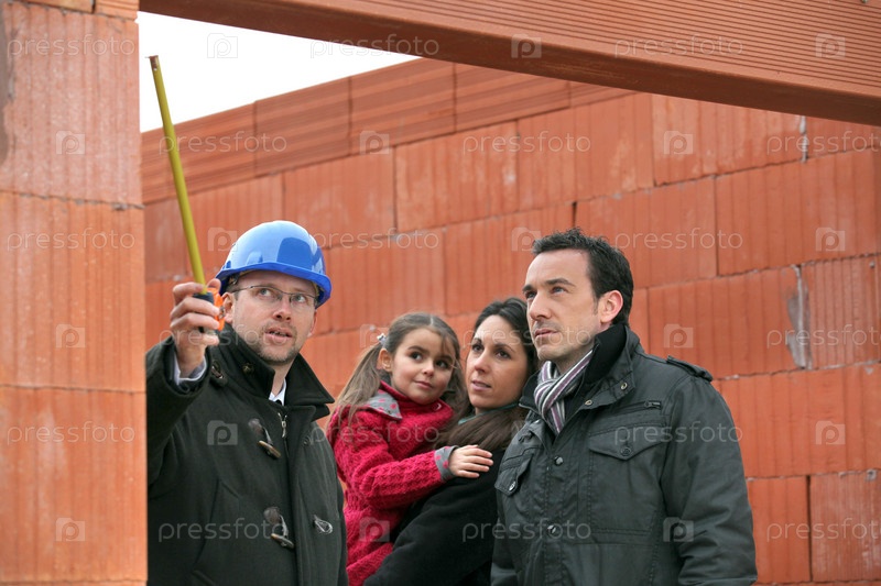 Семья на строительной площадке их будущего дома