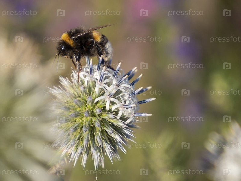 Echinops sphaerocephalus, сорт Arctic Glow, шмель на чертополохе, многолетнее луговое травянистое растение