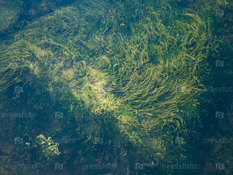 Подводные скалы, покрытые зелеными водорослями морских водорослей. Спокойная вода