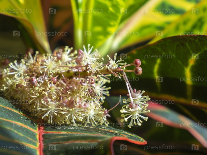Куст Codiaeum variegatum Petra с цветами, кротон, вид в крупном плане