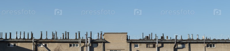 Ряд воздуховодов и дымоходов на верхней части крыши, панорамный вид