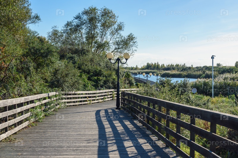 Длинная деревянная набережная вдоль побережья Балтийского моря. Янтарный. Калининградская область. Россия