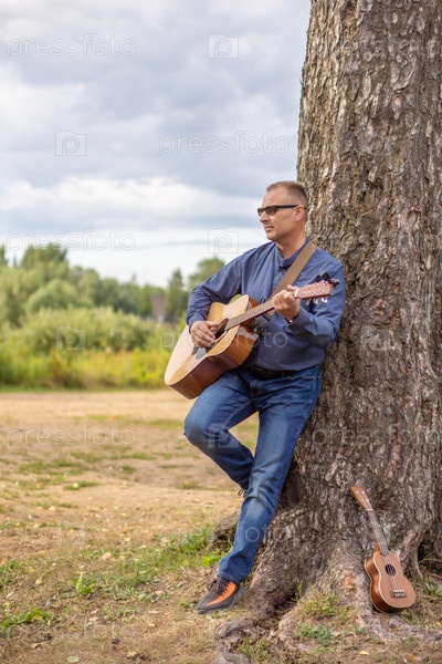 Мужчина с классической или испанской гитарой на природе. Концепции музыки и отдыха