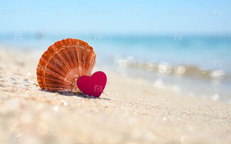 Маленькое розовое сердце рядом с большой красивой раковиной стоит на пляже на фоне моря. Концерт отличного отдыха в райском месте. Селективный фокус на сердце
