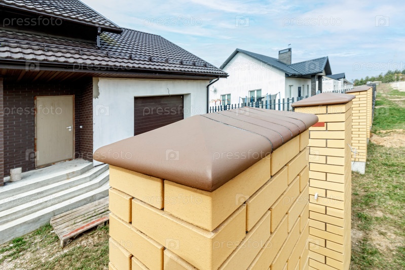 Фрагмент современного забора, облицованного декоративным кирпичом в старинном стиле