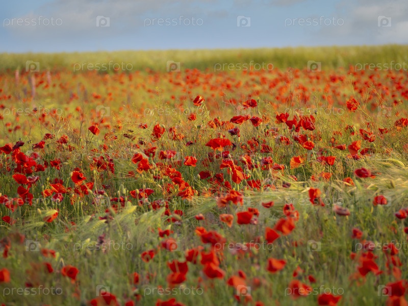 Цветущие красные цветы мака на злаковом поле в солнечный день