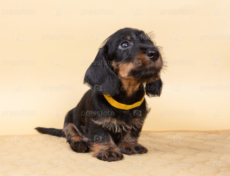 Маленький жесткошерстный щенок таксы на светлом фоне. Портрет собаки. Милые питомцы