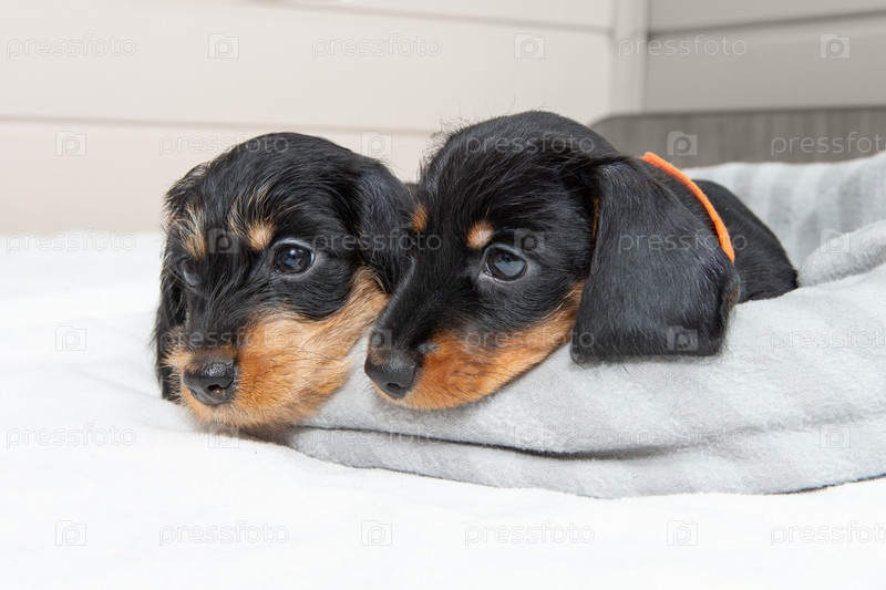 На кровати лежат милые щенки жесткошерстной таксы. Портрет собак. Милые питомцы