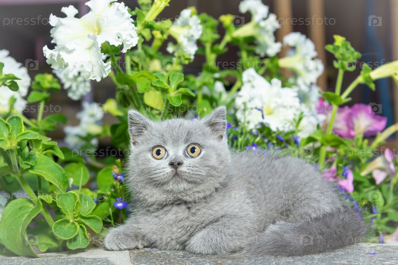 Британский серый короткошерстный котенок сидит на камне в траве крупным планом