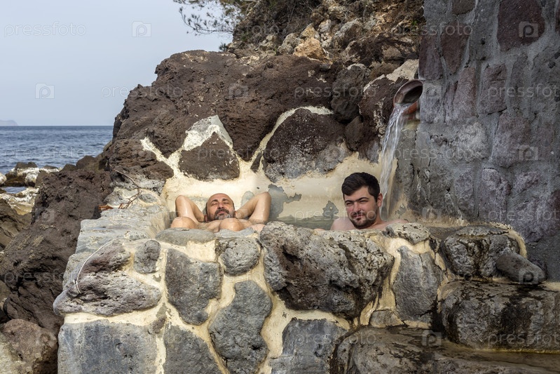 Мужчина и парень купаются в термальном источнике с горячими полезными минеральными водами (Пелопоннес, Греция)