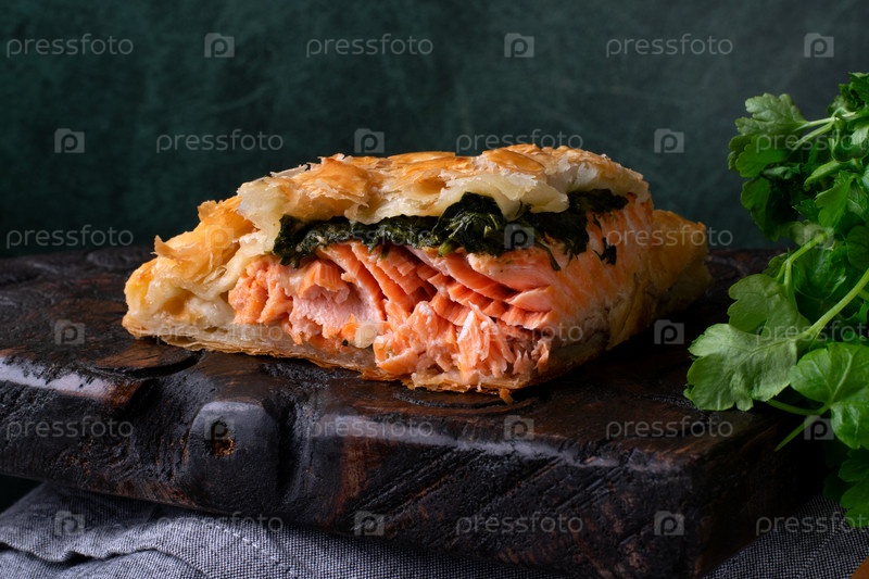 Пирог с начинкой из форели и шпината в слоеном тесте подается на темной деревянной доске