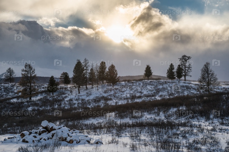 Первый снег и закатное солнце в темных облаках