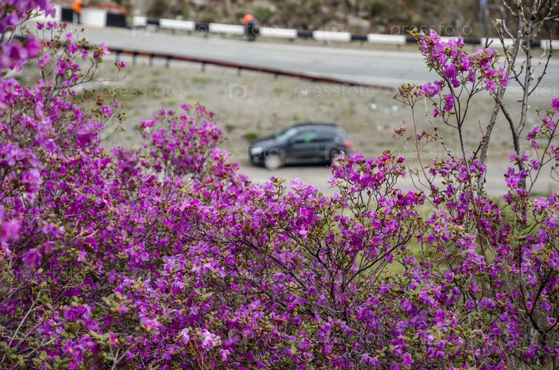Цветущий маральник, автомобиль и дорога вдалеке, вид сверху