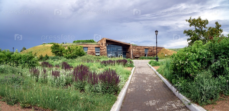 Вид Музея древесной археологии в Свияжске на фоне кустов лаванды