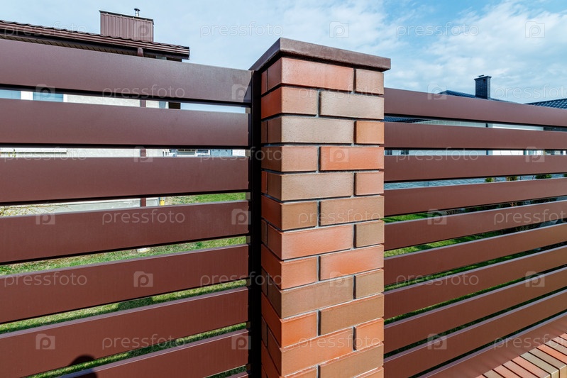 Фрагмент современного забора, облицованного декоративным кирпичом в старинном стиле