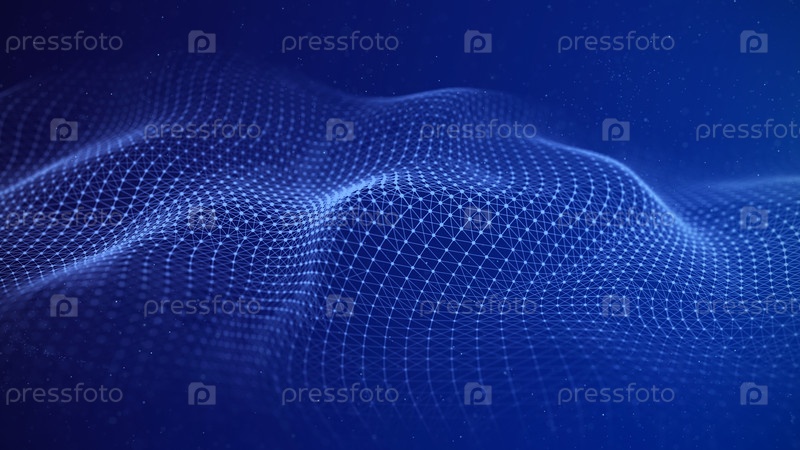 Волна с соединительными точками и линиями. футуристический рельеф на синем фоне. визуализация больших данных. 3D-визуализация
