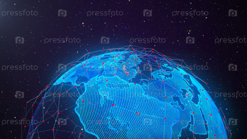 Подключение к всемирной сети. Глобальный фон планеты Земля. Большие данные. Высокотехнологичный пользовательский интерфейс. 3D-визуализация