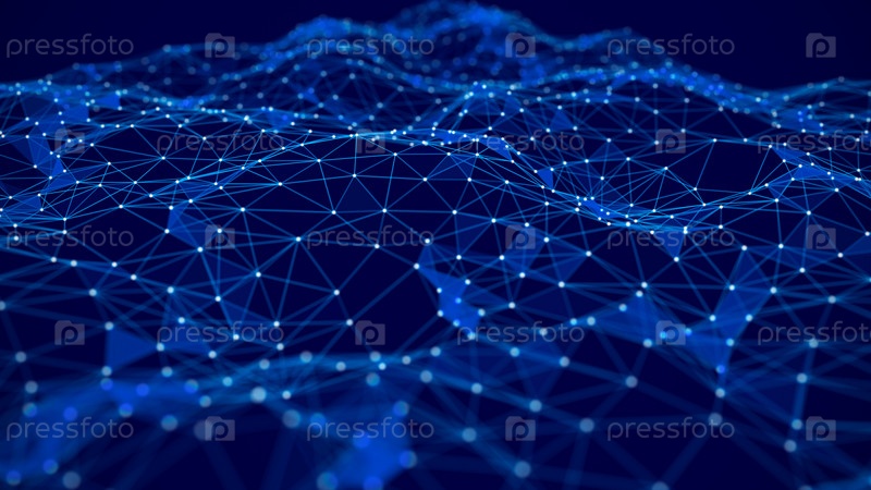 Волна соединительных линий и точек. Подключение к сети. Абстрактный фон из белых точек и синих линий. 3d визуализация