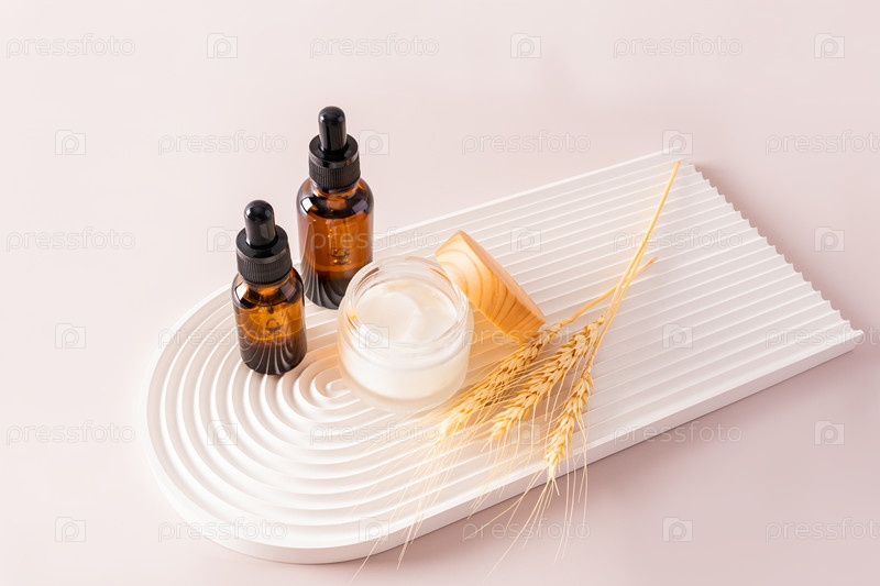 Две косметические бутылки с капельницей с косметическим органическим продуктом и баночка крема для ухода за собой на белом подносе в виде арки