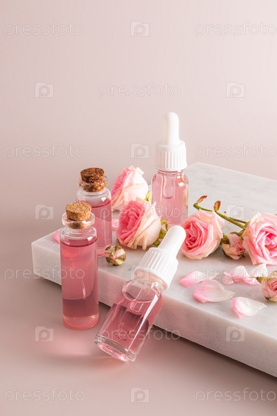Набор косметики и розовой воды в стеклянных бутылках среди маленьких свежих роз на подиуме из белого мрамора. Вертикальный вид