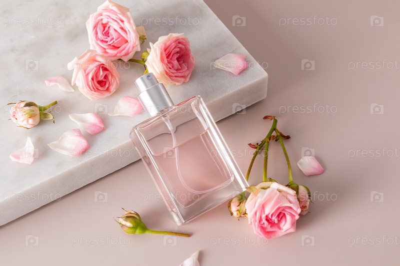 Элегантный стеклянный флакон женских духов или туалетной воды с нежным ароматом розы стоял на белом мраморном подиуме с маленькими живыми розами